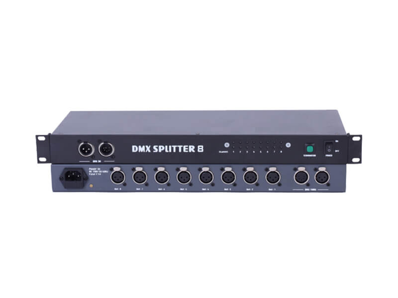 DMX 分路器尤其适用于覆盖长距离的 DMX512 应用,在这些应用中需要避免不需要的干扰和频率。DMX 分配器用作信号分配器和增强器。4 路输出到 8 路 DMX 输出,每路配备 3 针或 5 针 XLR 连接器,可兼容任何 DMX 设置并在所有输入/输出之间实现 100% 电气隔离。每个输出前面板上的信号和电源 LED 指示灯可用于检测错误。